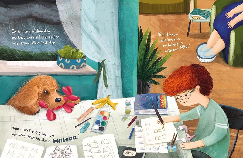 Lily Guzmán beautifully explained what was happening to Alex’s mom and allowed us to view her “not-so-good days” through his eyes. When mom had a fever, Alex compared her body to the sun. A simile that kids of many ages can comprehend. When his mom was too tired to read a bedtime story, Alex explained to his best friend and dog, Nico, that he knew his mommy still loved them because she checked on them while they slept.